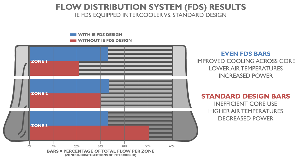 The IE FDS (Flow Distribution System) has proven to distribute charge air uniformly across the inlet end of the core. In contrast to other intercoolers on the market which rely on natural airflow across the core, our FDS technology uses precisely shaped and placed fins cast into the intake plenum to fully take advantage of the large core volume effectively using the entire core. As a result, the IE FDS intercooler has been proven to reduce intake air temperatures more so than other units available, thus offering the largest power gains possible.