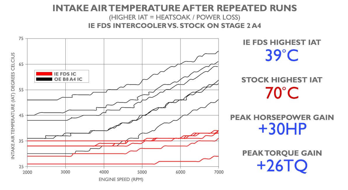 Heat soak occurs when the heat generated exceeds the cooling capacity of the intercooler. The most common symptom is the noticeable loss of power after long term acceleration or several back to back power pulls. By greatly increasing the core size and useable area of the core with FDS technology, we have eliminated the heat soak, keeping the intake air temperatures consistently lower than OEM and competition intercoolers.