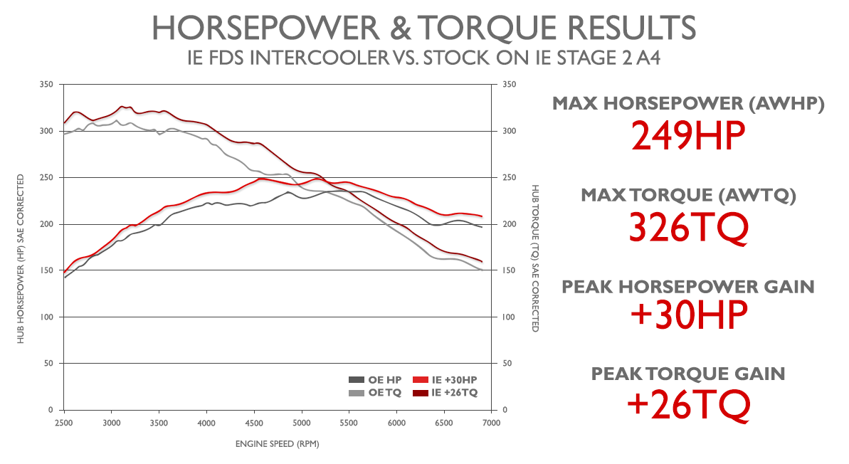 Increasing horsepower of your B8 A4 is a simple task with several tunes and upgraded turbos available. However, it is important to keep in mind that increasing horsepower will result in heat soak of the stock intercooler and parasitic power loss. The IE front-mount intercooler system was designed to directly replace the factory unit, while utilizing a much larger core and our proven FDS (Flow Distribution System) to effectively utilize that larger core. These features allow for much higher cooling efficiency than the factory system, thus reducing intake air temperatures and safely increasing horsepower output. The IE FDS intercooler is also a direct fit, requiring no cutting, modification, or time-wasting hassle during installation. Read below for more in-depth information on each intercooler feature.