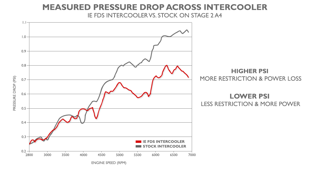 Along with lower intake air temperatures, the large core within the IE intercooler also decreases pressure drop when compared to the factory unit. Simply put, pressure drop is the amount of pressure that is lost as air travels through the intercooler. As boost pressure is raised, pressure drop typically begins to climb. By using a larger core that flows much more freely than the factory core, pressure drop is reduced, reducing the need for the turbocharger to work harder to produce the required boost levels.