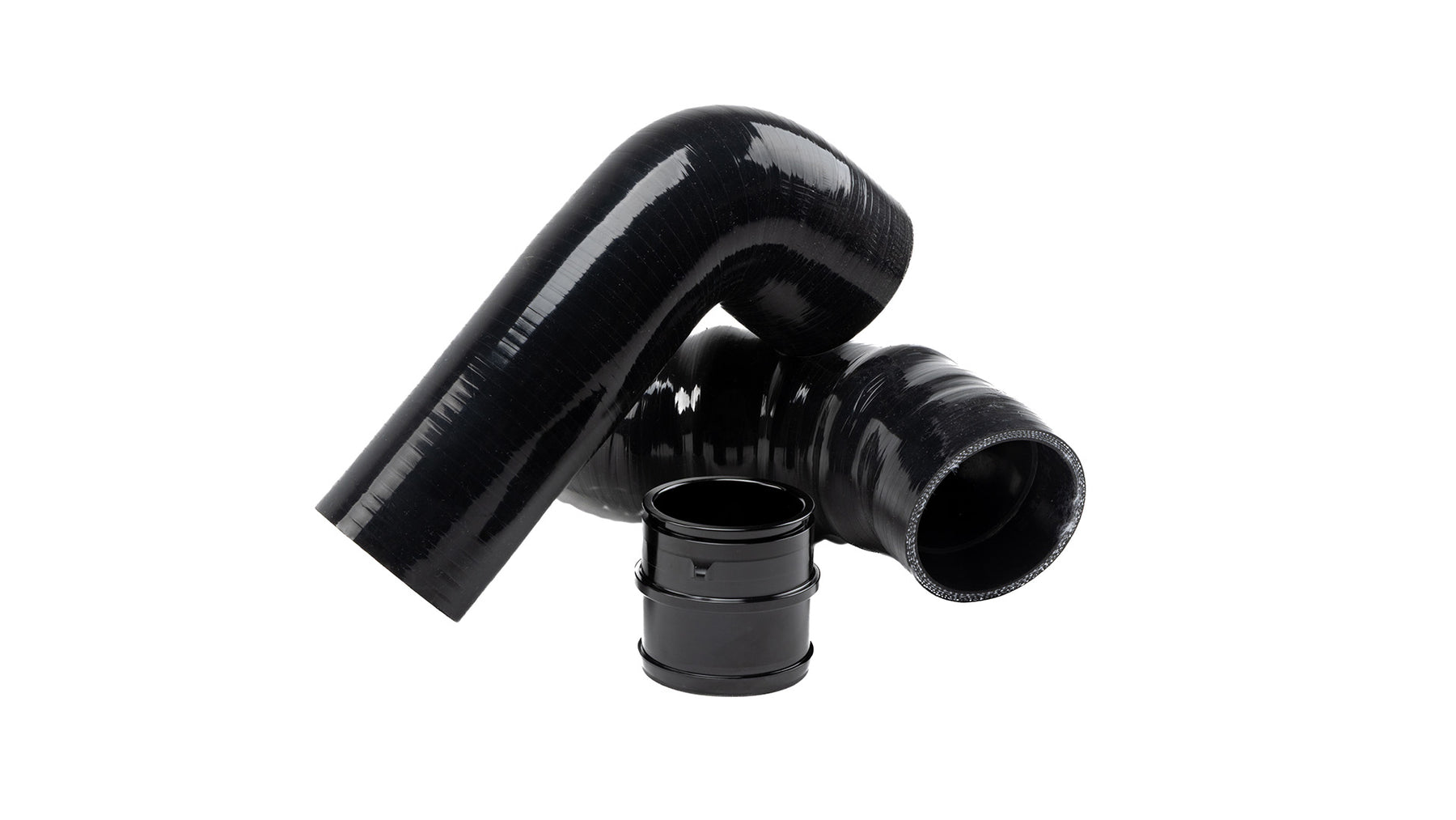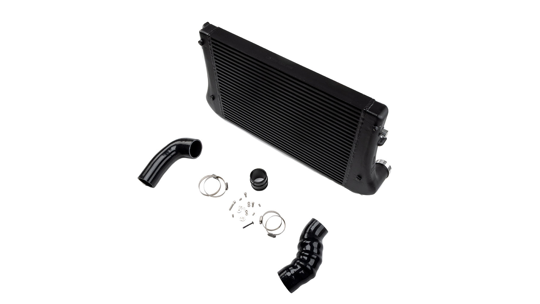 The intercooler kit includes the direct-fit core and all install hardware including heavy duty black silicone hoses, a billet adapter to connect the silicone hose to your OEM turbo outlet pipe, silicone hose clamps, and necessary bolts and washers.