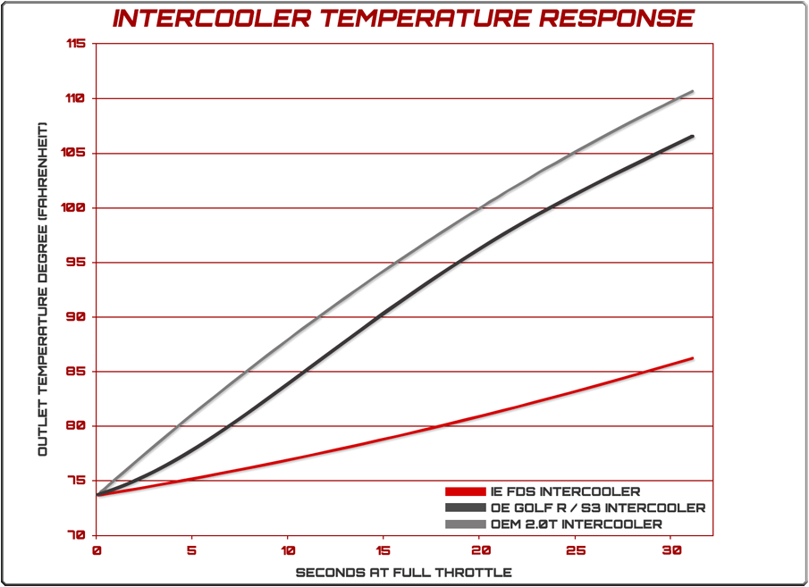 Keep your GTI and Golf R cool with the IE FDS Intercooler. The IE FDS intercooler has proven to distribute charge air uniformly across the inlet end of the core. In contrast to other intercoolers on the market which rely on natural airflow across the core, our FDS technology uses precisely shaped and placed fins cast into the intake plenum to fully take advantage of the large core volume effectively using the entire core. As a result, the IE FDS intercooler has been proven to reduce intake air temperatures more so than other units available, thus offering the largest power gains possible.