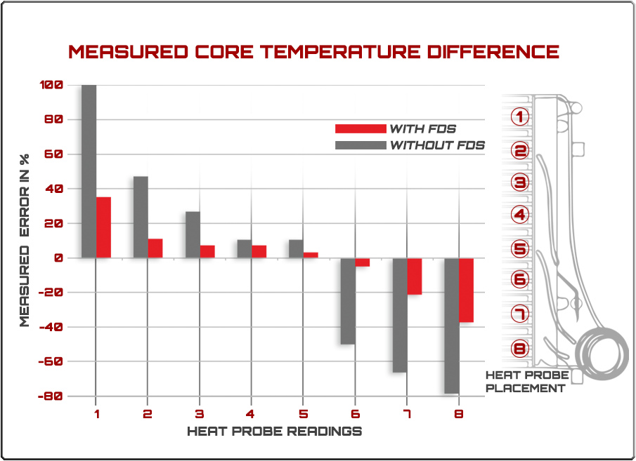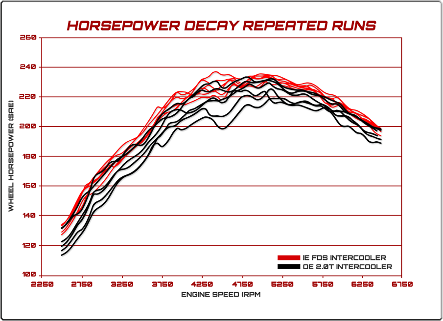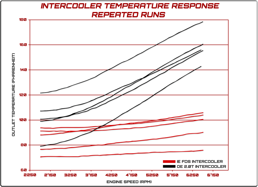 Go faster longer, retain power pull after pull. Heat soak occurs when the heat generated exceeds the cooling capacity of the intercooler. The most common symptom is the noticeable loss of power after long term acceleration or several back to back power pulls. By greatly increasing the core size and useable area of the core with FDS technology, we have eliminated the heat soak, keeping the intake air temperatures consistently lower than OEM and competition intercoolers.