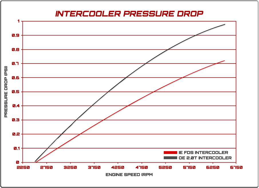 Along with lower intake air temperatures, the large core within the IE intercooler also decreases pressure drop when compared to the factory unit. Simply put, pressure drop is the amount of pressure that is lost as air travels through the intercooler. As boost pressure is raised, pressure drop typically begins to climb. By using a larger core that flows much more freely than the factory core, pressure drop is reduced, reducing the need for the turbocharger to work harder to produce the required boost levels.