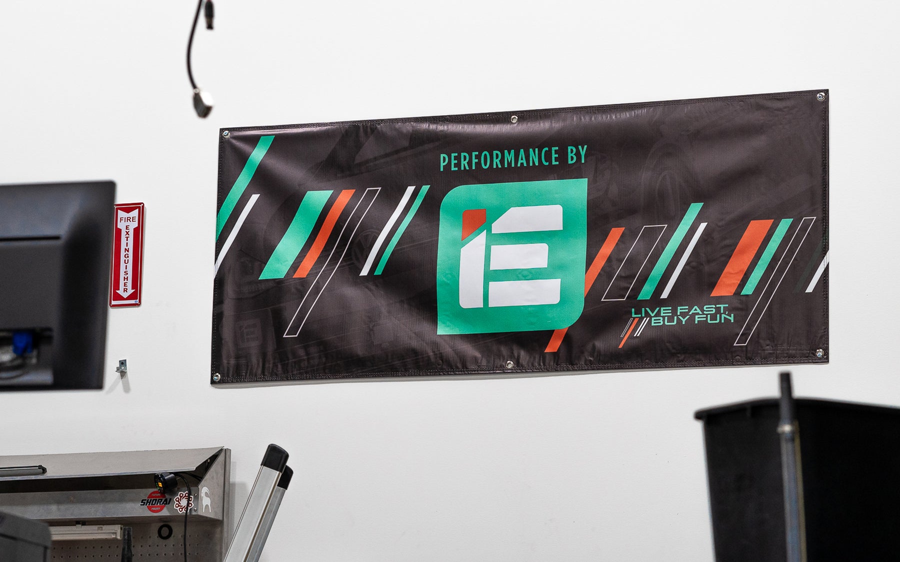 Spruce up your garage or shop bay with your very own IE 5X2.5-foot banner. This banner features vivid color printing on durable, heavy-duty thick gauge vinyl with double-stitched edges. Hangs via six integrated grommets to ensure this banner holds up to years of display on any shop wall.